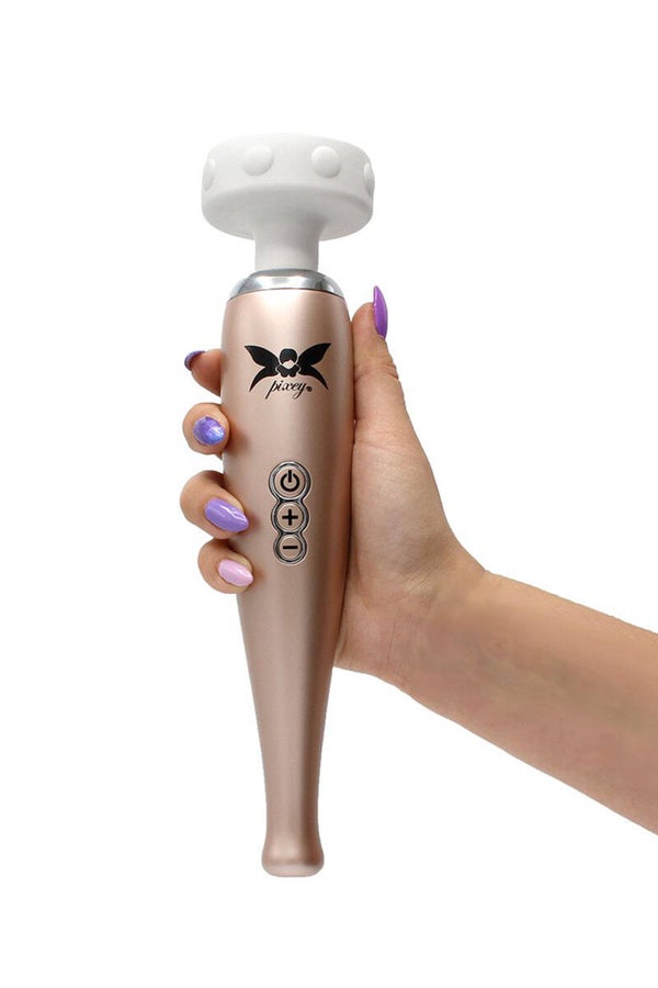 Découvrez le tout nouveau wand “Hammerhead” de Pixey au design moderne et féminin couleur Rose Gold, qui fera vibrer votre cœur de plaisir ! Le Wand Hammerhead Pixey dispose d’unetête plate façon “marteau” avec des détails perlés autour de la tête, qui permet une stimulation plus précise et inoubliable ! Facile à utiliser, le Wand Hammerhead de Pixey a 3 boutons afin de basculer entre les 5 vitesses de vibration et les 5 modes de pulsations ainsi qu'une prise en main ergonomique pour une expérience orgasmique optimale. Le Wand “Hammerhead” est fabriqué à partir de silicone TPE hypoallergénique, facile à nettoyer et de qualité premium. Pour une utilisation optimale, Le Wand Hammerhead de Pixey est rechargeable par USB (câble fourni, temps de charge de 2 à 3 heures).