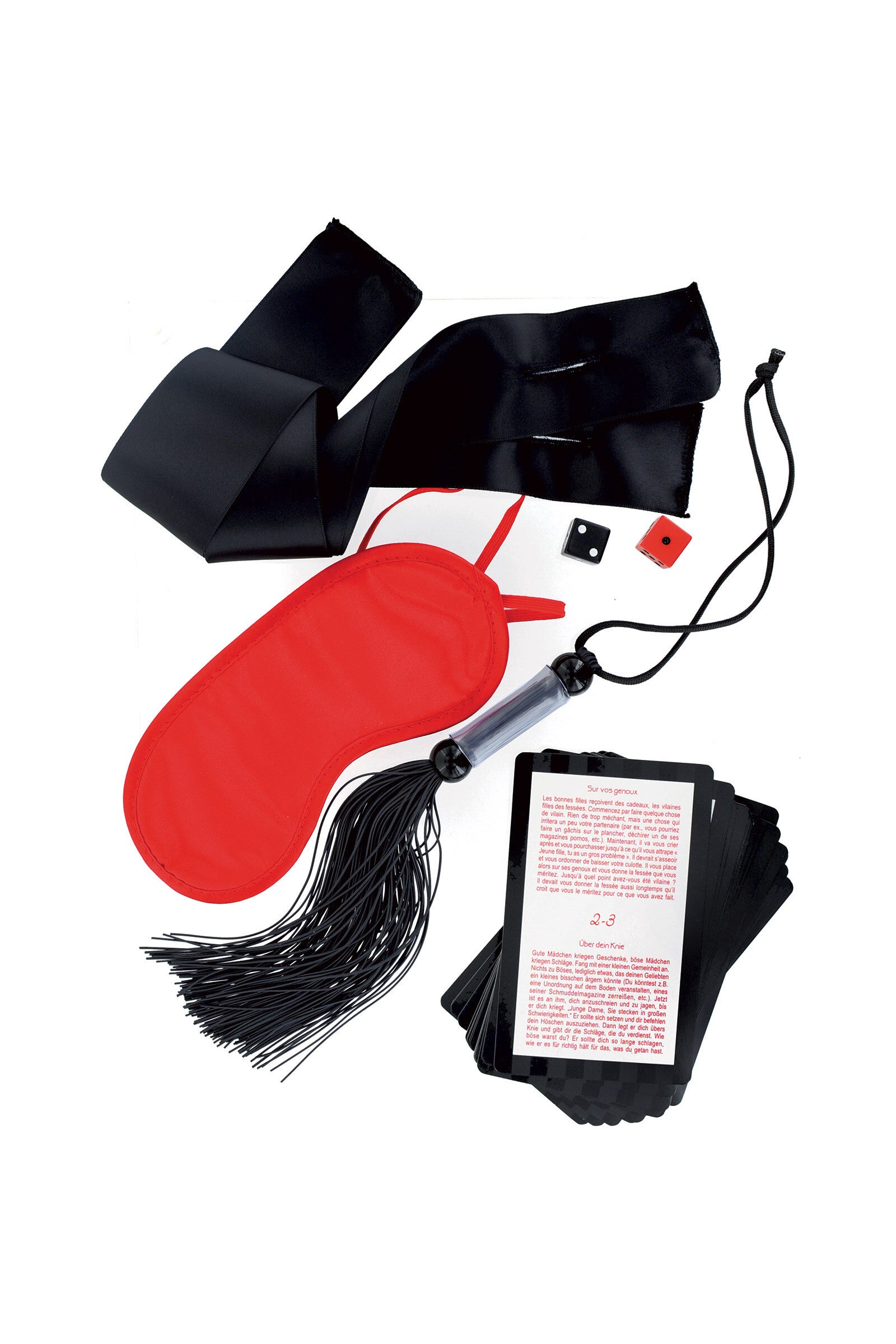 Contient : 36 cartes Séduction Soumission, 2 rubans de soie, 2 dés, 1 masque, 1 petit martinet, 1 règle du jeu. Boite : 18 x 18 x 5cm