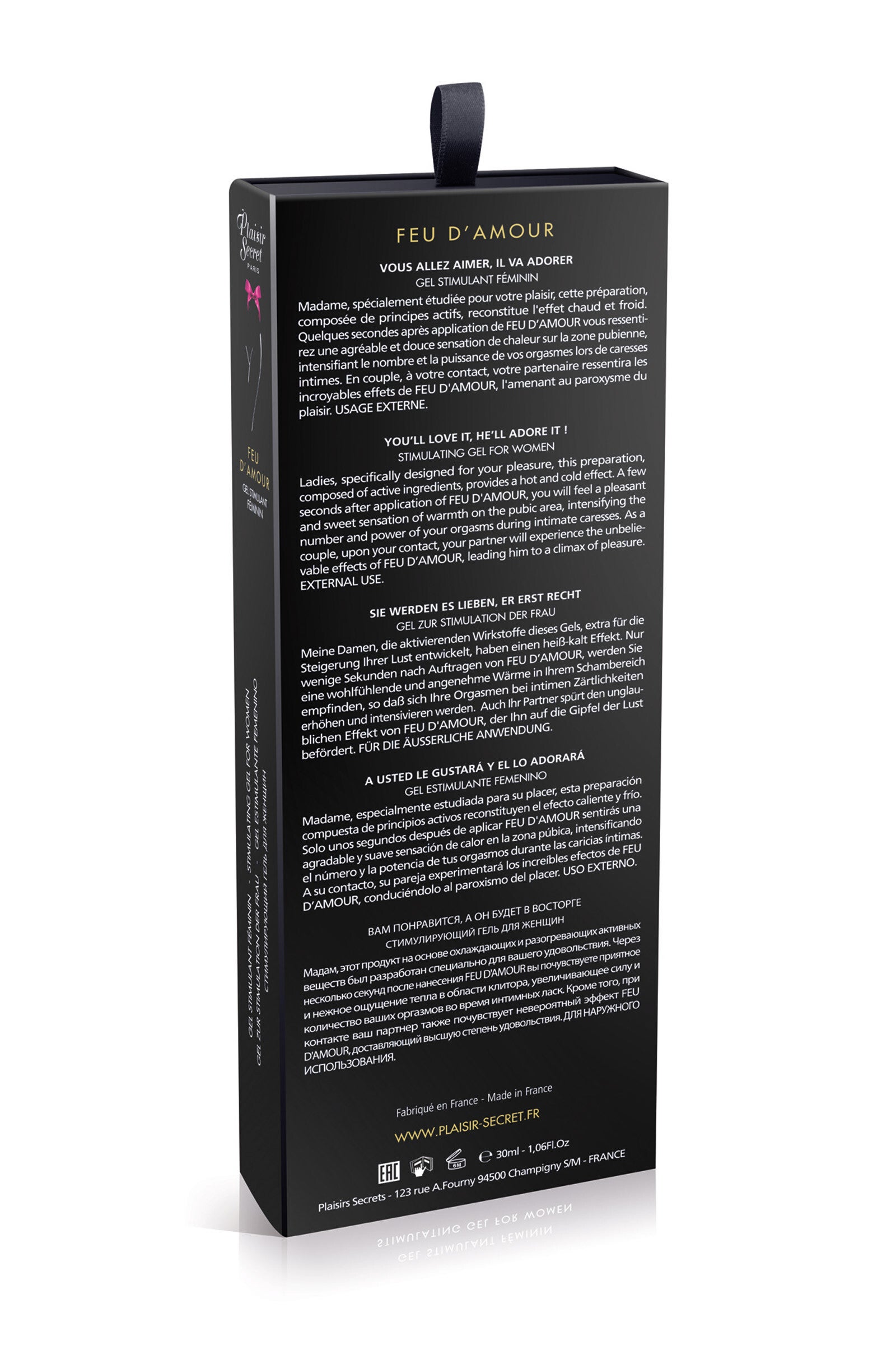 Votre coffret deFeu d'Amour gel intime stimulant féminin Plaisir Secret comprend une notice d'utilisation et un catalogue complet de la gamme Plaisir Secret.